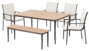 - includes a table, four chairs, and a bench